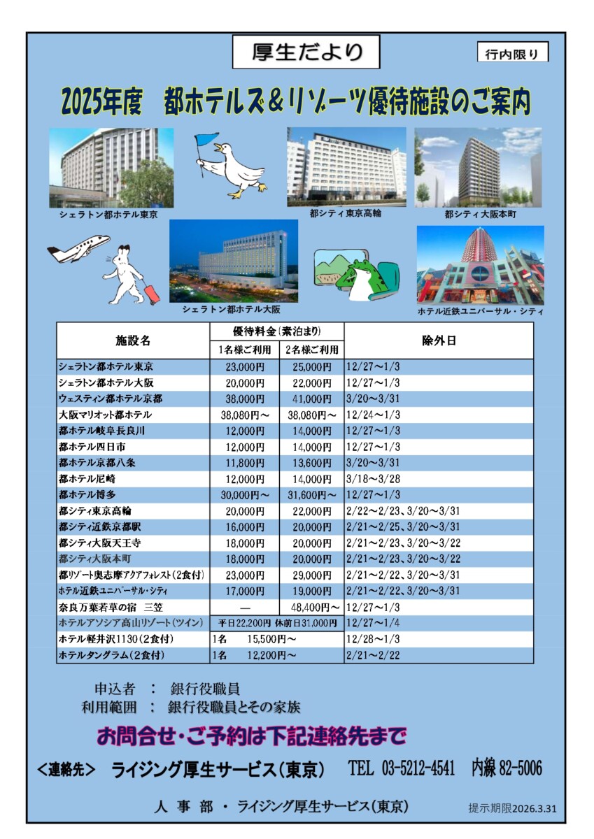 ◎厚生施設利用申込書(エクセルシート)は、廃止いたしました。WEBからのお申込みをお願いします(2026/1)。⇒WEB申込リンク